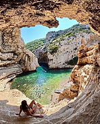 The most iconic cliff jumping spot near Hvar. These dramatic red-tinted cliffs on the south coast offer multiple jump points at different heights. The 3-meter ledge is perfect for first-timers, while the 8-meter platform attracts experienced jumpers. The deep, clear water below gives excellent visibility to check for obstructions.